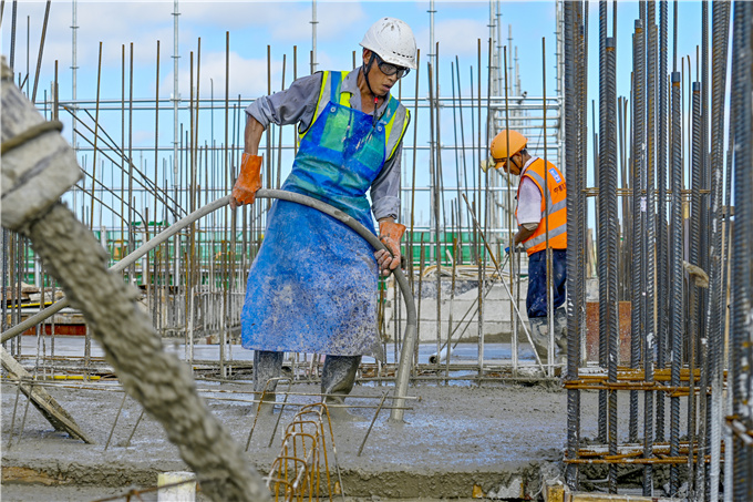 海口市人民医院西院项目施工现场,工人在使用振导器使混凝土密实结合。海口日报记者石中华 摄