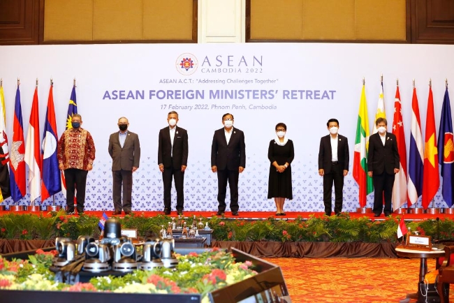 2022年2月17日,东盟国家外长在柬埔寨首都金边举行非正式会议,承诺确保全面有效实施区域全面经济伙伴关系协定(RCEP)。图为与会嘉宾合影留念。新华社发(索万纳拉摄)