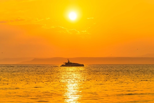 ↑这是7月6日在俄罗斯符拉迪沃斯托克拍摄的落日余晖中的游艇。新华社发(郭飞洲摄)