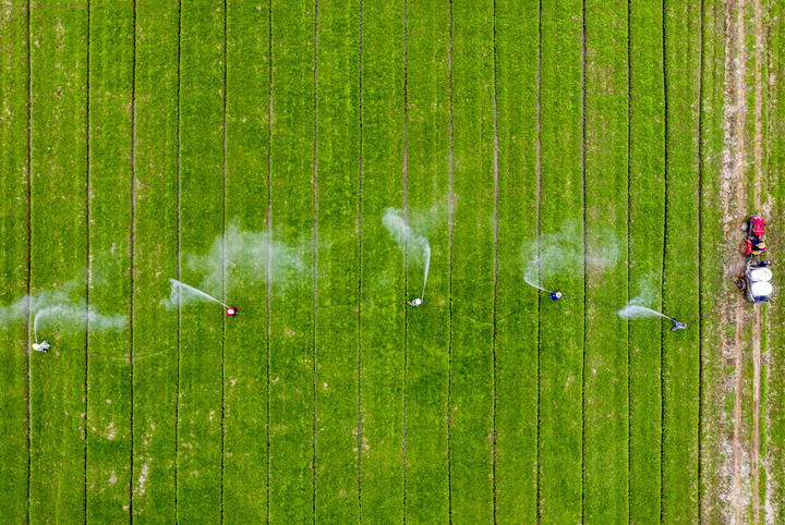 ↑2月16日,安徽省庐江县白湖镇农民在进行小麦病虫害防治作业(无人机照片)。新华社发(左学长摄)