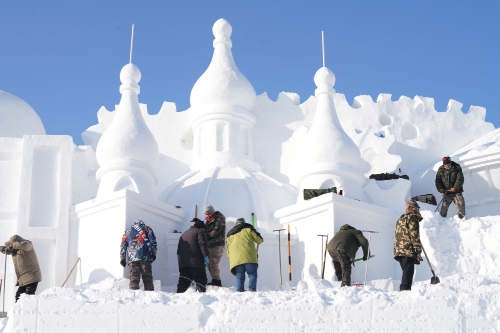 ↑12月18日,雕刻师在哈尔滨太阳岛国际雪雕艺术博览会园内进行大型雪塑创作。新华社记者 王松 摄