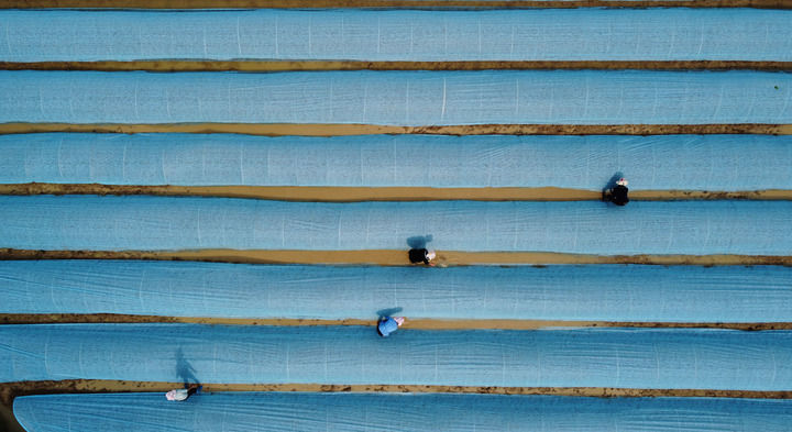↑ 4月26日,村民在贵州省黔东南苗族侗族自治州台江县台盘乡阳芳村水稻育秧基地管护水稻秧苗(无人机照片)。新华社发(余天英摄)