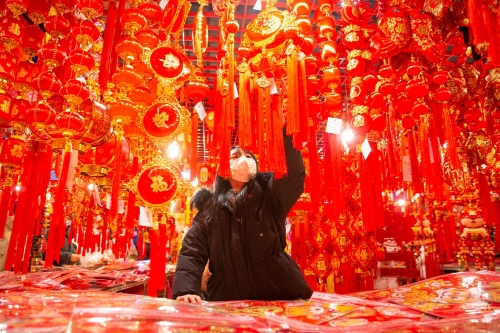 ↑ 1月28日,市民在南京一家商贸城内选购春节饰品。新华社发(苏阳摄)