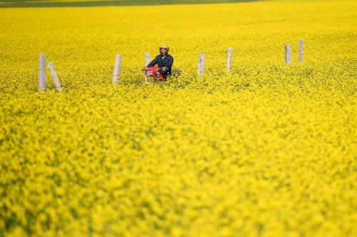 ↑7月3日,在青海省海北藏族自治州门源回族自治县,蜂农骑着摩托穿过油菜花田。新华社记者 张龙 摄