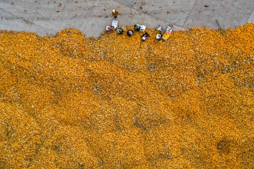 ↑ 11月1日,农民在吉林省公主岭市环岭街道土城子村志和农机服务专业合作社内分拣收获的玉米,准备进行下一步的储存工作(无人机照片)。新华社记者 许畅 摄