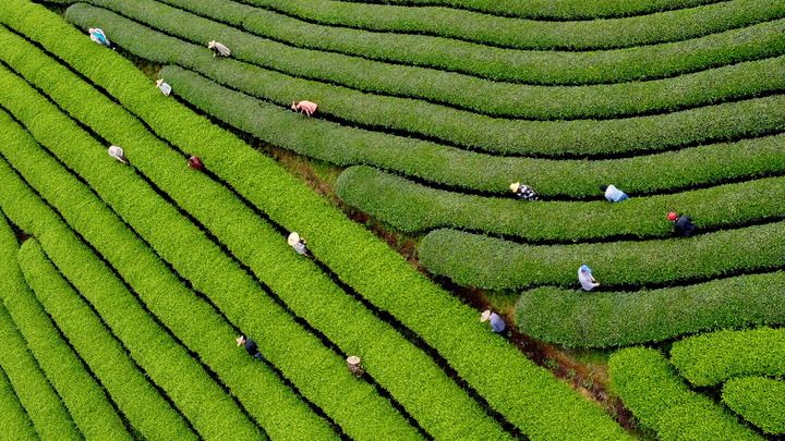 ↑4月15日,茶农在武夷山市星村镇的茶山上采摘新茶(无人机照片)。新华社发(陈颖摄)