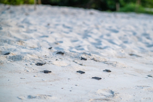 ↑ 6月14日,在马来西亚丁加奴州热浪岛北部査加尔瑚棠海龟保护区,小海龟们奔赴大海。新华社记者 朱炜 摄