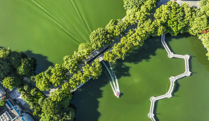 ↑10月3日,游客乘船游览广西桂林市桂湖(无人机照片)。新华社发(刘峥摄)