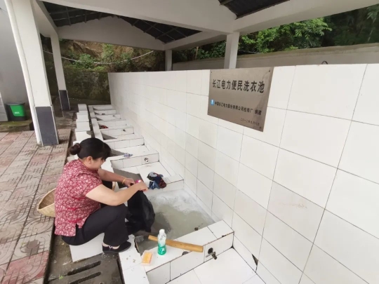 在许家冲村广场,村民仍然保留着用棒槌洗衣的传统。过去是在江边洗衣服,现在是无磷洗衣粉,污水进行集中处理,既照顾到村民生活习惯又环保。
