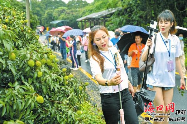 5月13日,在海口市秀英区永兴镇的荔枝园内,网红主播正在直播推介海口火山荔枝王。 记者 石中华 摄