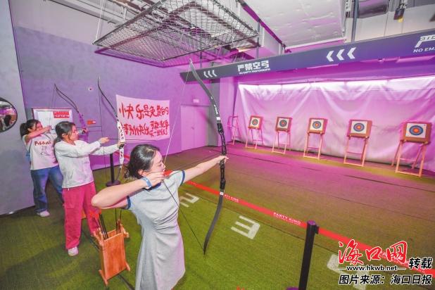 5月12日21时许,位于海甸岛华彩·海口湾广场5楼的一家运动中心热闹非凡。射箭、保龄球、飞镖、投篮机、VR游戏、桌面足球等花样繁多的体验项目吸引了众多青年人在此游玩,解锁各种新奇体验。