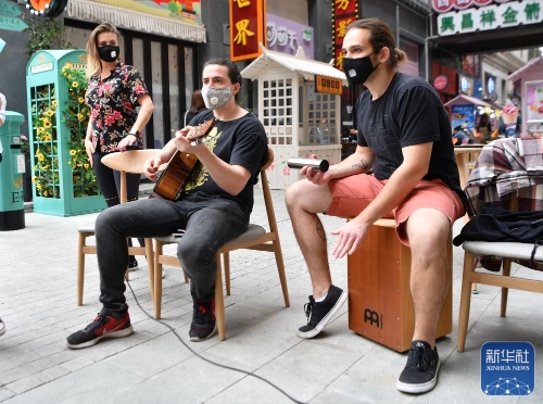 ↑2020年4月16日,一支来自巴西的乐队在西安市未央区一处商业街区进行户外表演。新华社记者 张博文 摄