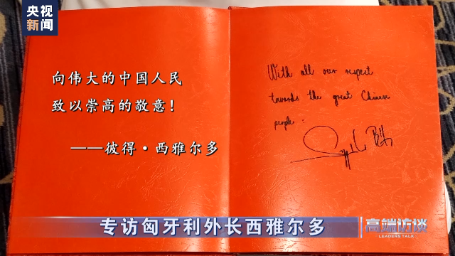 匈牙利外长西雅尔多在接受总台专访后题词: