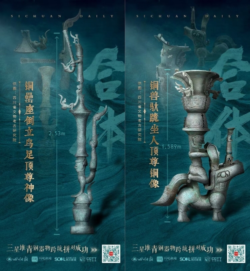6月10日,四川省文物考古研究院再次公布了两件青铜器物跨坑拼对成功的消息。这两件文物分别是铜罍座倒立鸟足顶尊神像和铜兽驮跪坐人顶尊铜像,器物组成分别来自二号坑、三号坑以及八号坑。