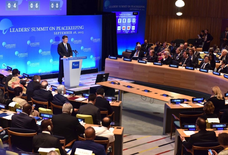 2015年9月28日,国家主席习近平在纽约联合国总部出席联合国维和峰会并发表讲话。新华社记者 李涛 摄