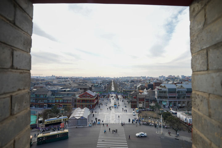 2024年12月26日,从正阳门箭楼内向南拍摄的北京前门大街和远处的永定门城楼。新华社记者 鞠焕宗 摄