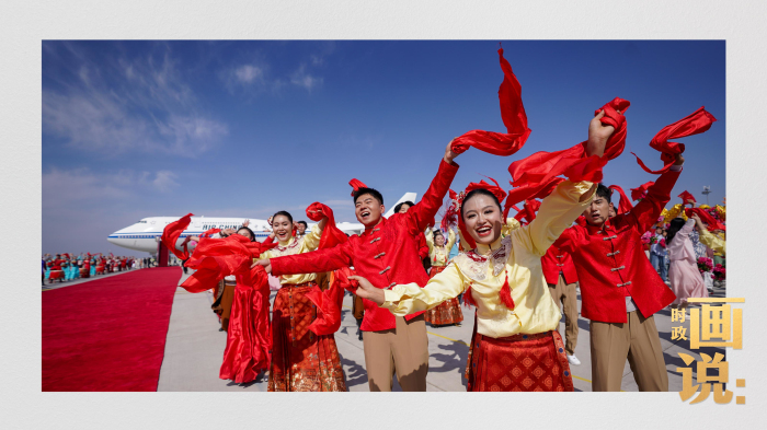 中共中央总书记、国家主席、中央军委主席习近平率中央代表团23日下午乘专机抵达乌鲁木齐,出席新疆维吾尔自治区成立70周年庆祝活动。习近平在机场受到新疆各族群众的热烈欢迎。