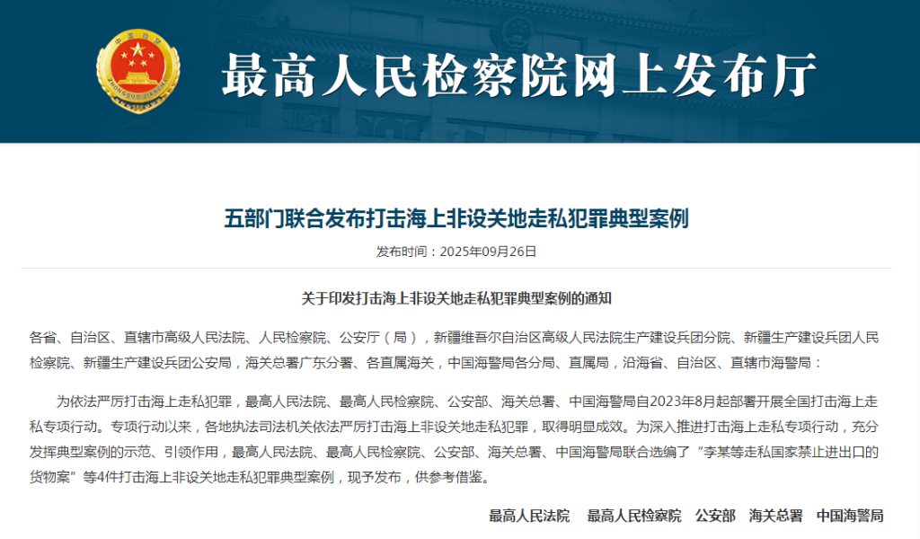 9月26日,最高人民法院、最高人民检察院、公安部、海关总署、中国海警局联合发布打击海上非设关地走私犯罪典型案例,包括“李某等走私国家禁止进出口的货物案”等4件。