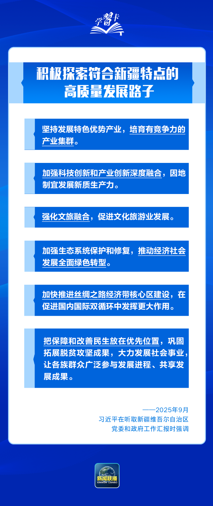 24日,习近平在听取新疆维吾尔自治区党委和政府工作汇报时强调,新疆要完整准确全面贯彻新时代党的治疆方略,锚定中央赋予的“五大战略定位”(亚欧黄金通道和向西开放的桥头堡、构建新发展格局的战略支点、全国能源资源战略保障基地、全国优质农牧产品重要供给基地、维护国家地缘安全的战略屏障),努力建设团结和谐、繁荣富裕、文明进步、安居乐业、生态良好的社会主义现代化新疆。