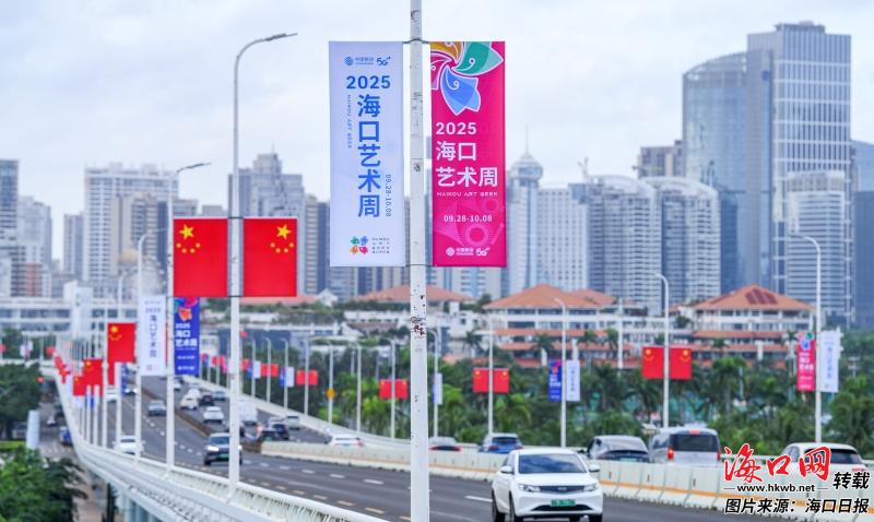 9月27日,海口世纪大桥上挂满了国旗和2025海口艺术周的道旗。 记者 苏弼坤 摄