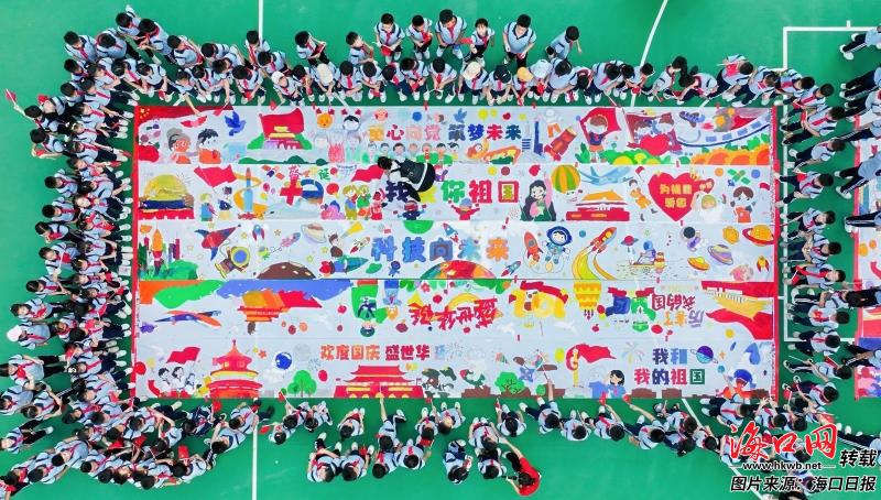 9月30日下午,以“童心绘中华,长卷庆华诞”为主题的庆祝国庆百米长卷少儿绘画活动在海口市第三十一小学举行,300余名小学生借助各色画笔和颜料,描绘对美好生活的憧憬。