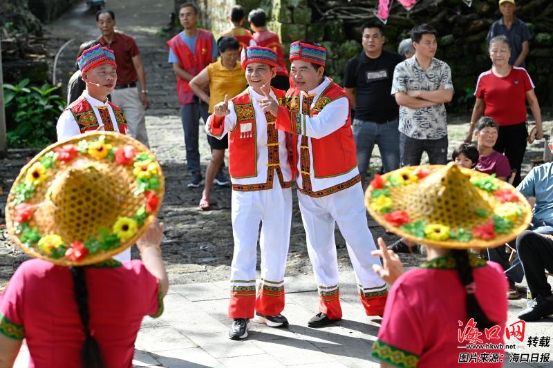 10月3日,村民在海口三卿村演唱火山民歌,吸引市民游客驻足欣赏。记者 石中华 摄