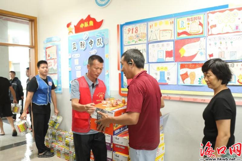 在新海学校安置点内,工作人员有序发放物资。(秀英区供图)