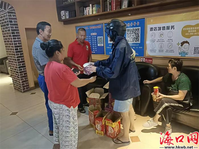此外,海秀街道金鼎社区迅速行动,针对已转移至安置酒店的危房居民,组织社区工作人员开展“送物资、保民生”行动。社区工作人员提前梳理居民需求,采购方便面、八宝粥等应急物资,逐一向安置酒店的居民分发,同时耐心询问居住情况与实际困难,确保转移群众在台风天住得安心、生活有保障,用贴心服务筑牢防汛抗台“安全防线”。