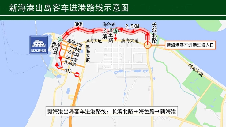 滨海大道—新海大道—海色路—新海港站前广场(接送客点)—海色路—新海大道—滨海大道