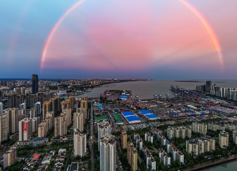 10月6日清晨,海口市上空出现彩虹。今年第21号台风“麦德姆”对海口的影响趋于结束,海口城区逐步恢复正常秩序。