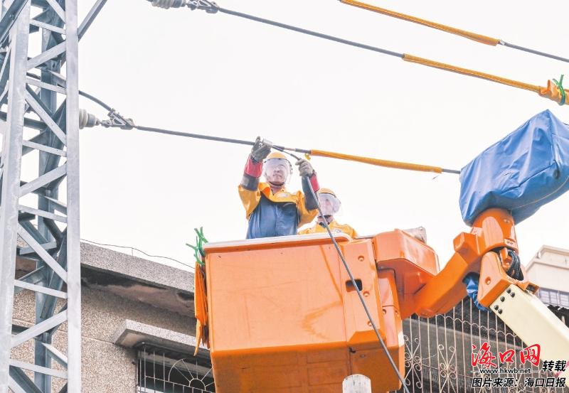 10月6日,在龙华区龙华二横路,海口供电局工作人员正在抢修电路。记者 孙士杰 摄