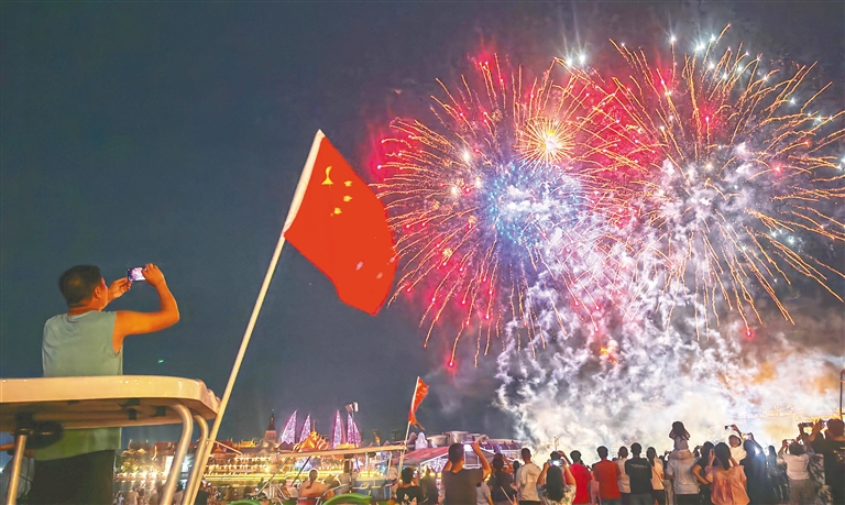 10月6日中秋夜,儋州海花岛旅游度假区内,璀璨烟花秀吸引游客驻足观看。当晚,该景区还同步上演无人机大秀,为游客献上沉浸式光影盛宴。