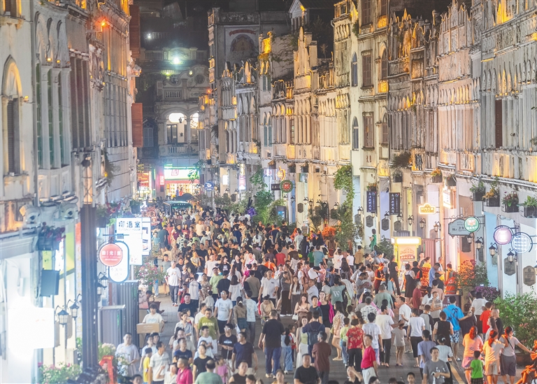 10月6日,众多市民游客在海口骑楼老街游玩、赏月。