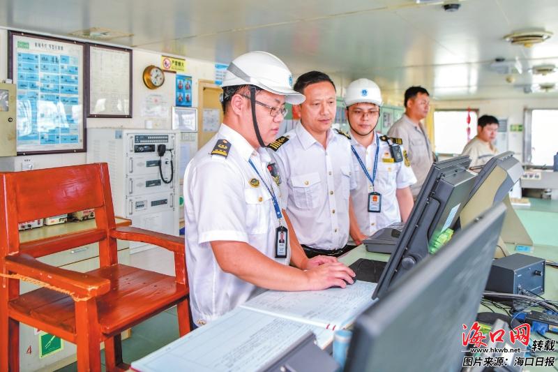 10月6日,在秀英港宝岛12号客滚船上,魏霆(左一)正在驾驶台查看设备情况。记者 苏弼坤 摄