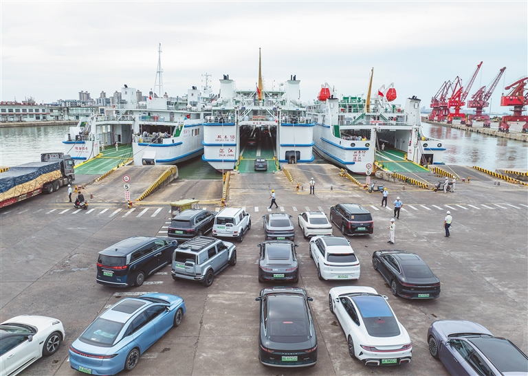10月6日,海口秀英港复运,新能源汽车有序登船。随着台风“麦德姆”影响逐渐消退,琼州海峡已于当日上午陆续恢复运输。秀英港启用9个泊位,通过最大化利用泊位资源,快速提升车辆吞吐效率。