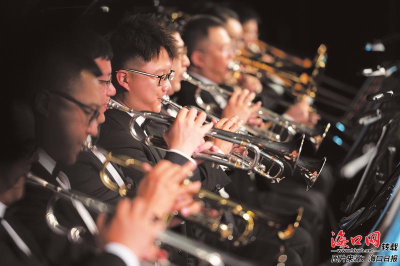 在清华校友管乐团海南巡演首站演出现场,团员们正在演奏《田野序曲》。记者 石中华 摄