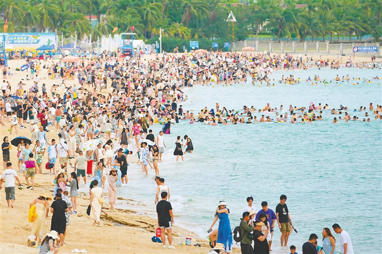 近日,在三亚大东海旅游区,众多国内外游客前来游玩度假,在碧海蓝天间乐享惬意假期。记者 王程龙 摄