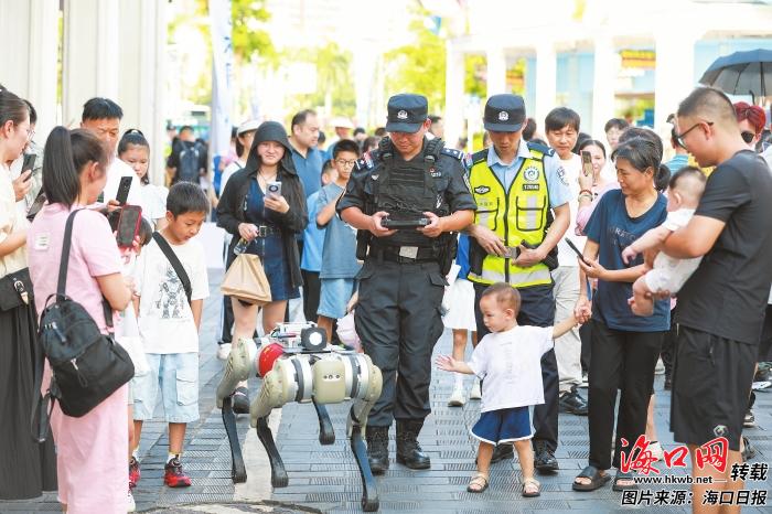 假期里,民警巡逻用上高科技,智能机器狗上路,吸引了市民游客的关注。(海口警方提供)