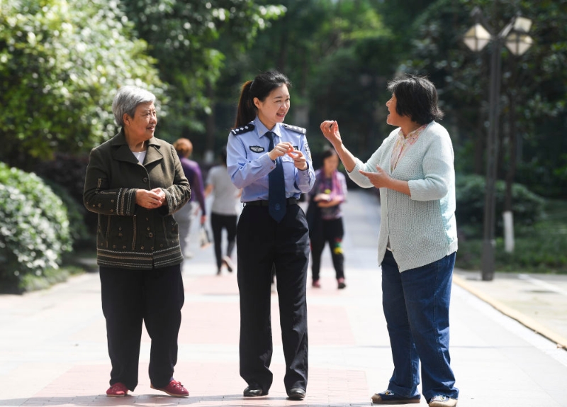 2021年4月27日,重庆市公安局沙坪坝区分局磁器口派出所民警何巧(中)与磁建村社区的聋哑群众交流。何巧用一年多时间自费学会通用手语,把辖区近200名听障居民当成亲人,沟通无声与有声的“双重世界”。