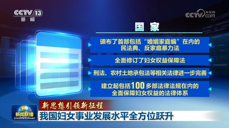 新时代,保障妇女权益作为国家意志充分彰显,法治保障体系更加完善。国家颁布了首部包括“婚姻家庭编”在内的民法典、反家庭暴力法,全面修订了妇女权益保障法,刑法、农村土地承包法等相关法律进一步完善,建立起包括100多部法律法规在内的全面保障妇女权益的法律体系。