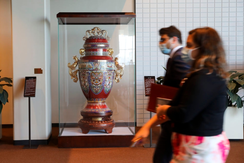 这是2021年10月21日在纽约联合国总部拍摄的中国政府赠送的“和平尊”。新华社记者 王迎 摄