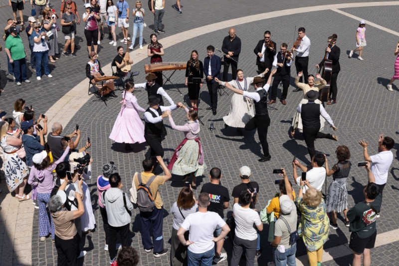 6月14日,为庆祝首个文明对话国际日,“对话·知音”文明对话国际日主题活动在匈牙利首都布达佩斯举行。图为中匈艺术家在城市快闪音乐活动上表演。新华社发(弗尔季·奥蒂洛摄)