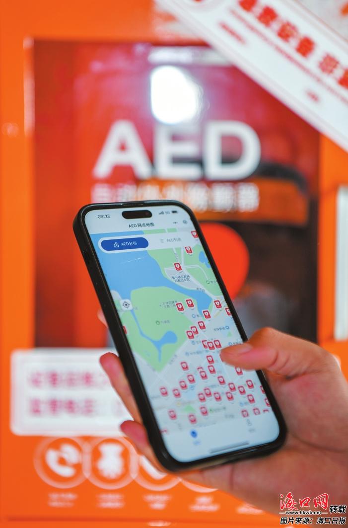 在万绿园急救安全屋内,工作人员展示海口市内AED设备分布图。记者 苏弼坤 摄