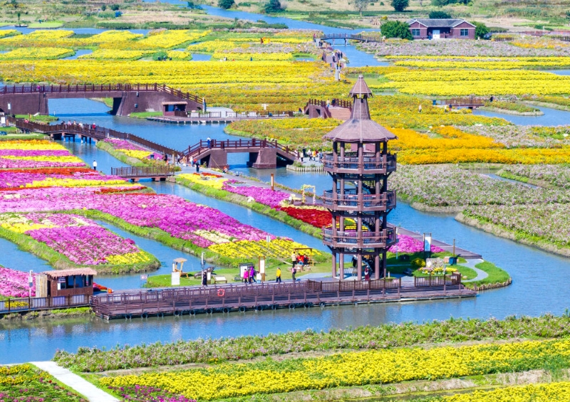 10月23日,游客在江苏省兴化市千垛景区赏菊游玩(无人机照片)。 新华社发(周社根 摄)