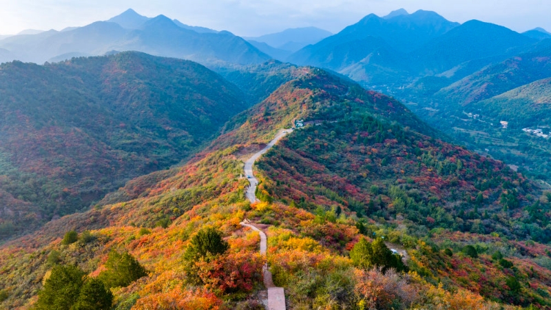 这是10月21日在山西省运城市平陆县三门镇马泉沟村拍摄的红叶美景(无人机照片)。 新华社发(权永军 摄)