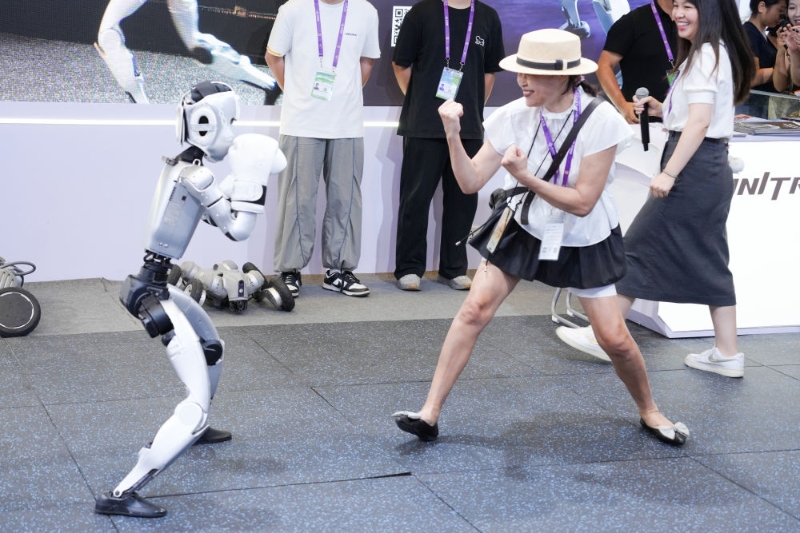 9月19日,在广西南宁市举办的第22届中国—东盟博览会上,一台人形机器人表演“拳击”,与观众互动。新华社记者 周汀鹭 摄
