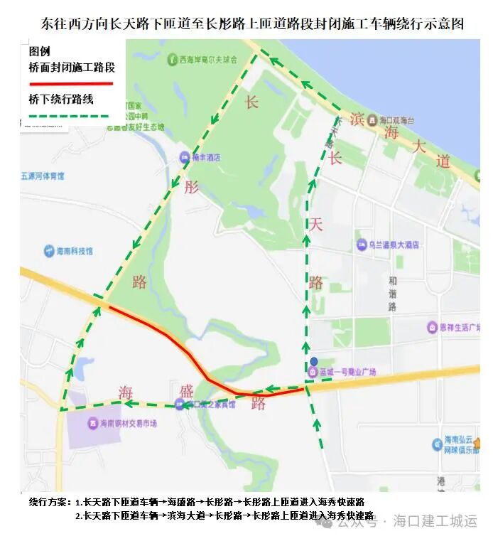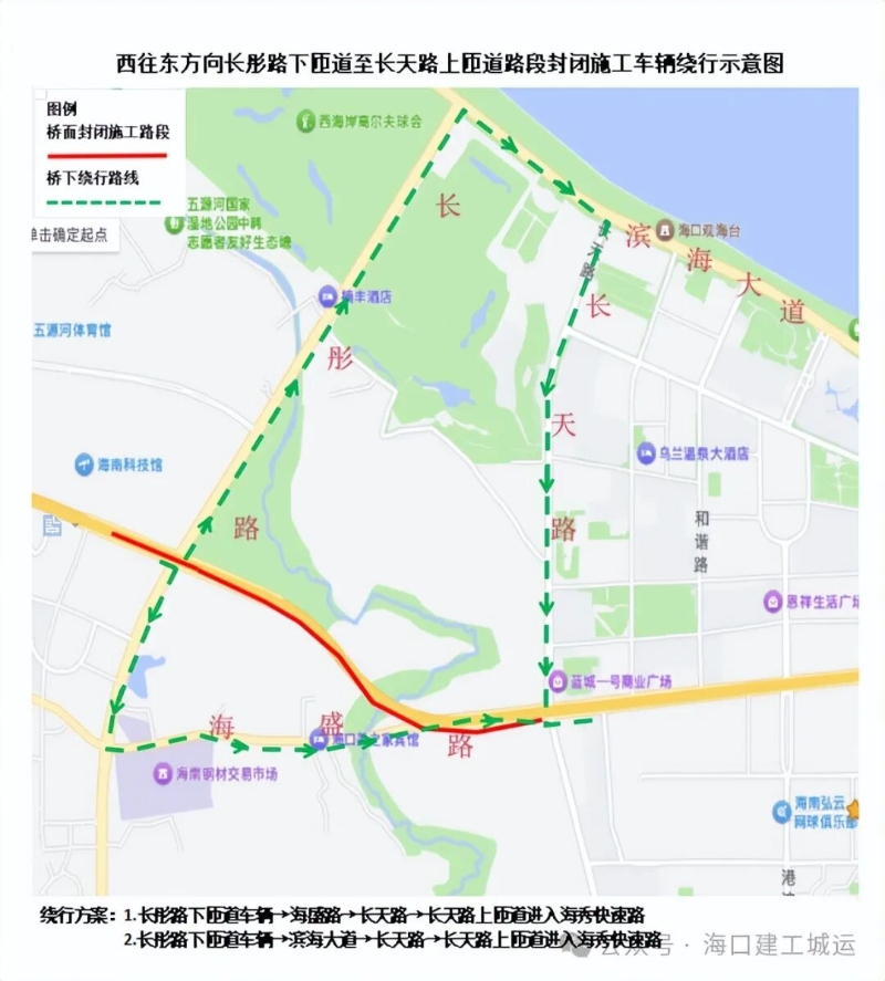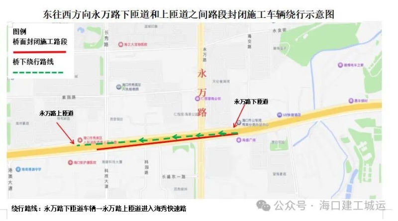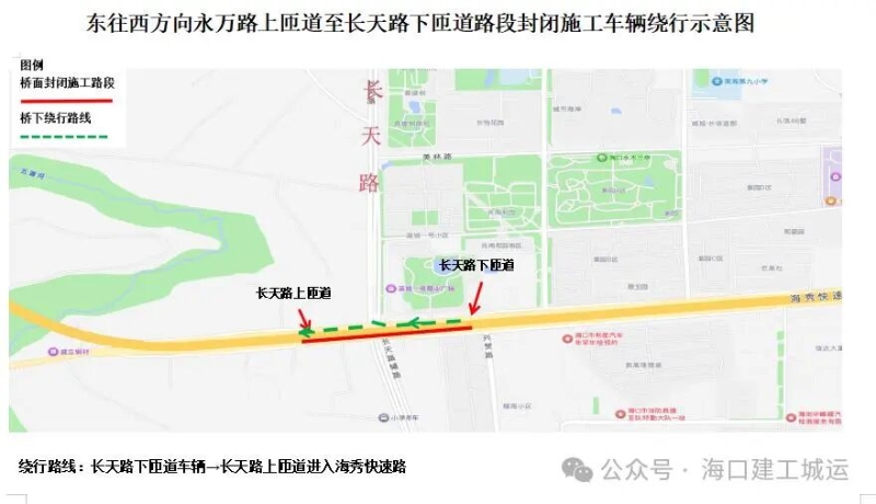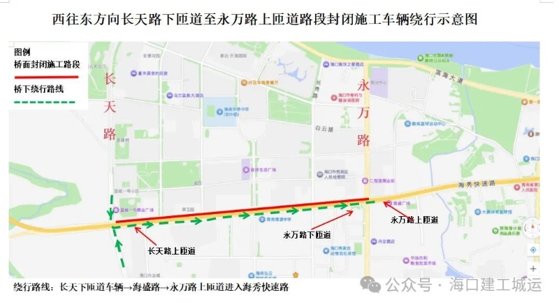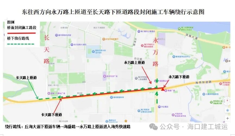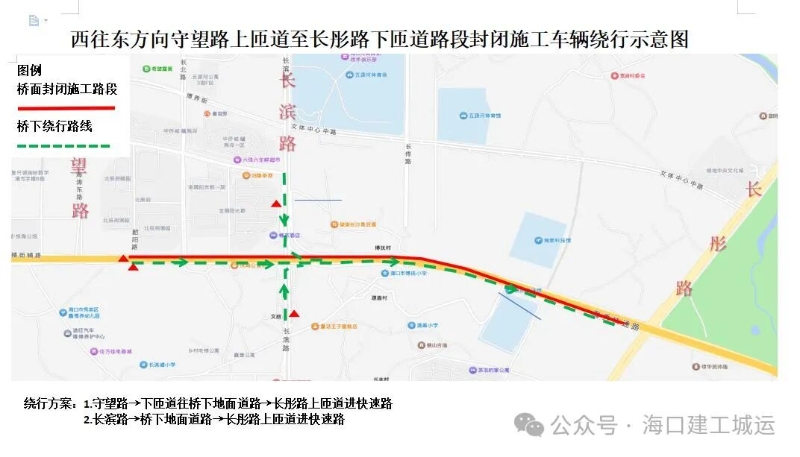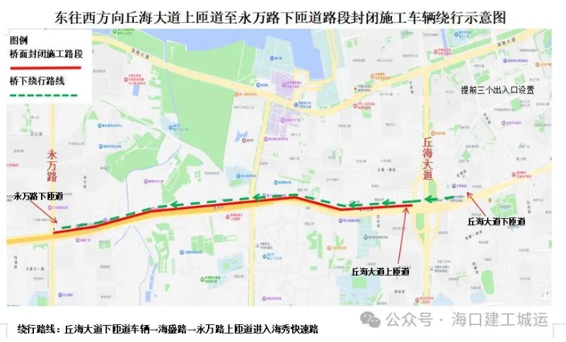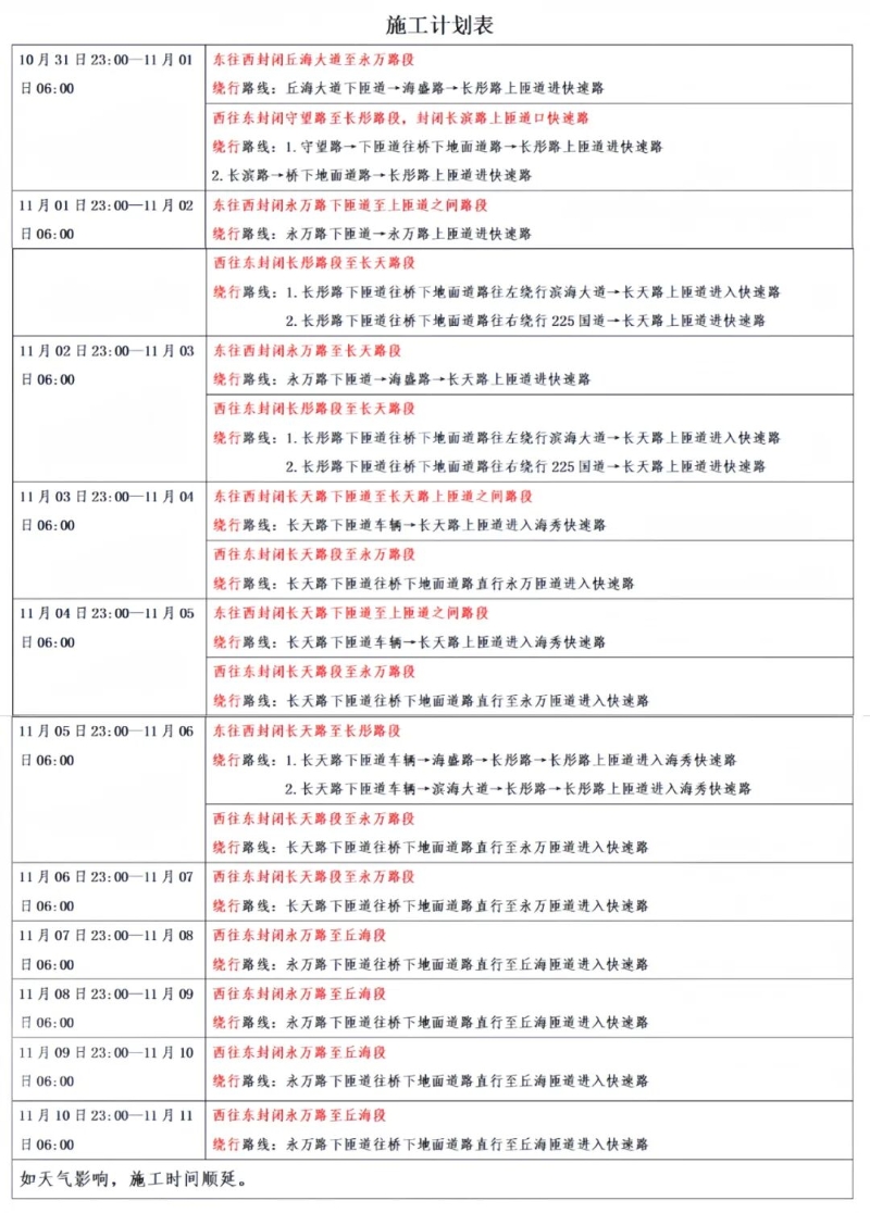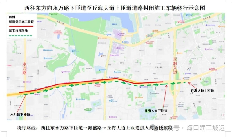 根据海秀快速路长滨路匝道至丘海大道下匝道东西双向桥面沥青修复工程施工需要,施工期间临时对部分路段进行交通管制,管制时间为10月31日—11月16日(每日23:00—次日06:00),具体管制路段见如下施工计划表。请市民根据交通提示标牌和导航提示绕行,给市民带来不便,敬请谅解。