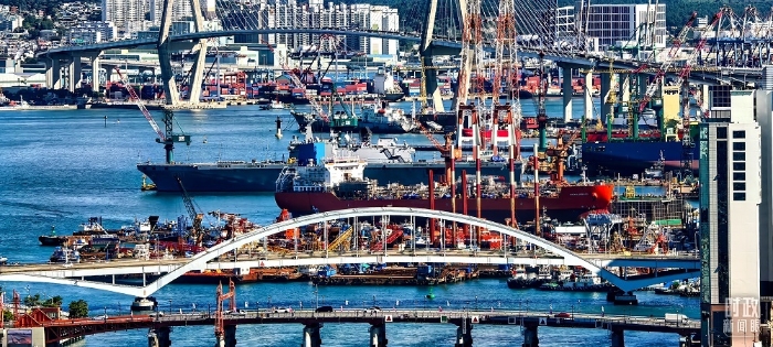 △韩国釜山繁忙的港口。(总台央视记者陈汉章拍摄)
