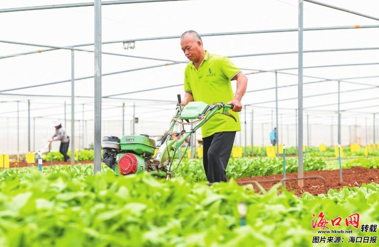 作为海口重要的“菜篮子”保供基地,苍东村近年来在政府与农户的共同努力下,已建成连片的简易大棚设施。这些大棚与田间农膜共同构成一道防护体系,有效减少天气对作物生长的影响,保障本地蔬菜的稳定供应。图为农户在操作犁地机犁地。