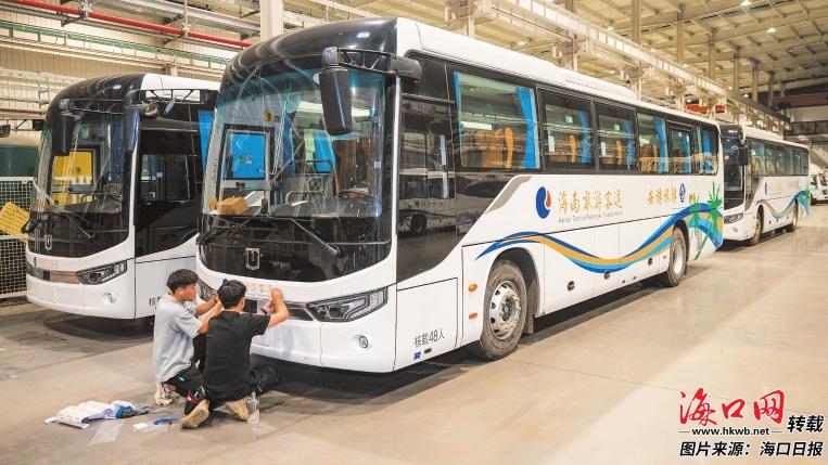 11月3日,位于海口国家高新区的海南远程新能源商用车工厂总装车间内,工人们正在一丝不苟地为纯电旅游大巴贴膜,为交付使用做收尾工作。